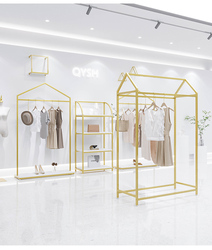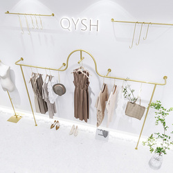 Tùy Chỉnh Cửa Hàng Bán Lẻ Quần Áo Giá Treo Tường Phụ Nữ Cửa Hàng Thiết Kế Thép Không Gỉ Vàng Quần Áo Ăn Mặc Hiển Thị Giá